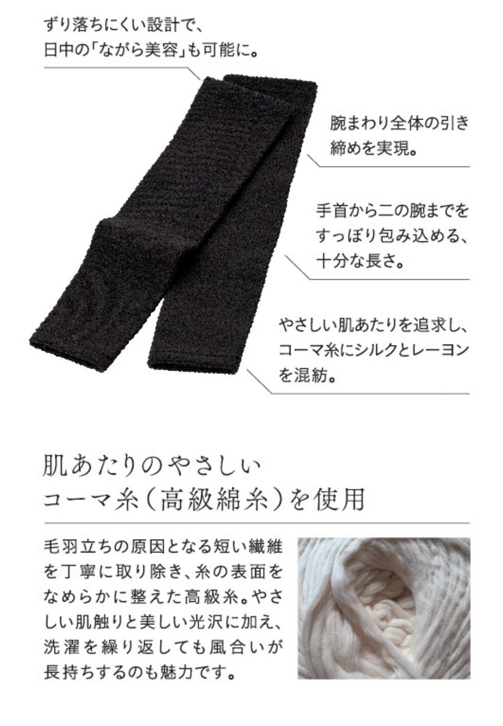 光電子繊維を贅沢に使用し、体温を利用した遠赤外線の働きで腕まわりをやさしく温めながらめぐりをサポート。