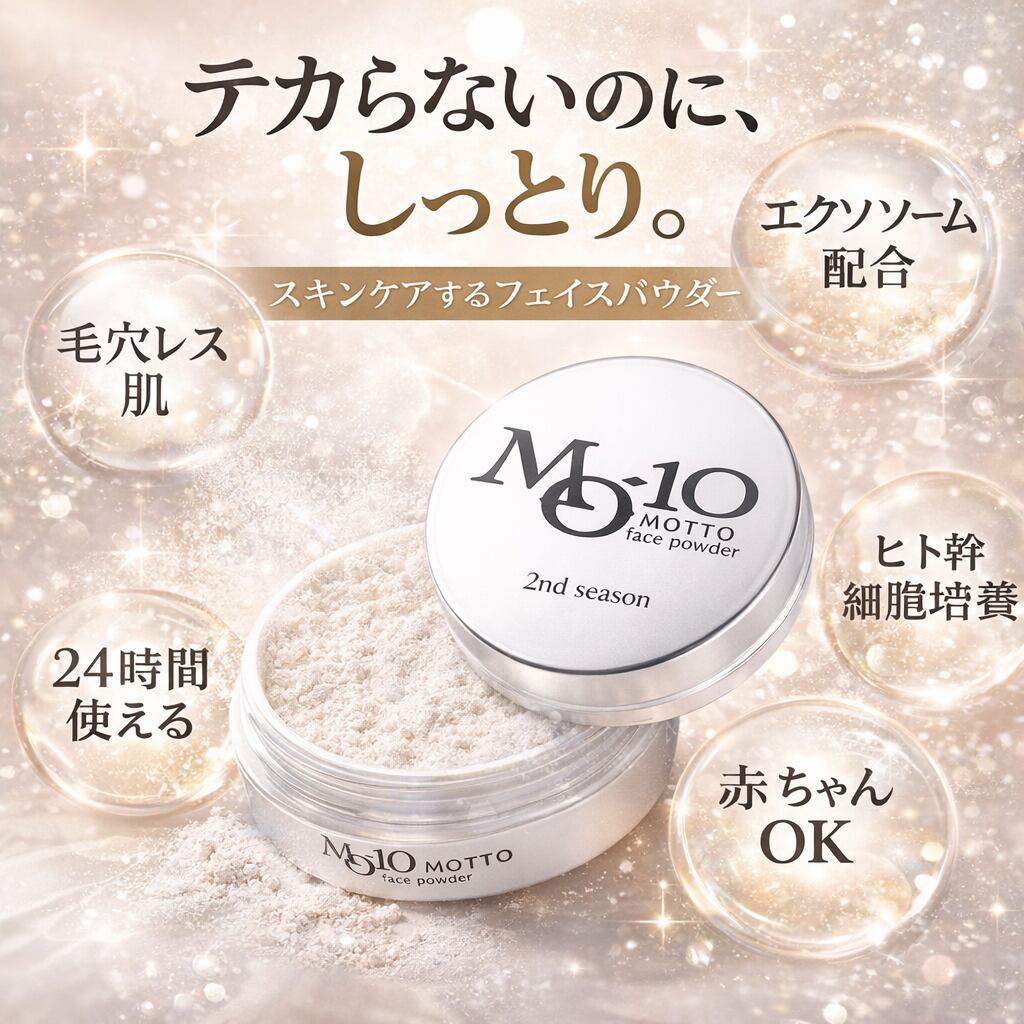 Mottoは、ヒト幹細胞培養液+ハイブリッドエクソソームを配合した次世代フェイスパウダー。