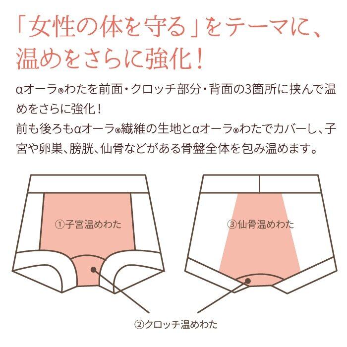 前も後ろもαオーラ繊維の生地とαオーラわたでカバーし、子宮や卵巣、膀胱、仙骨などがある骨盤全体を包み温めます。