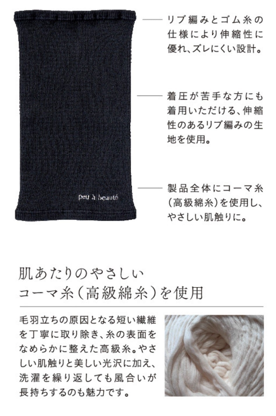 製品全体にコーマ糸(高級綿糸)を使用し、コーマ工程の中で短繊維を取り除く事で毛羽が抑えられ、肌の刺激を軽減します。