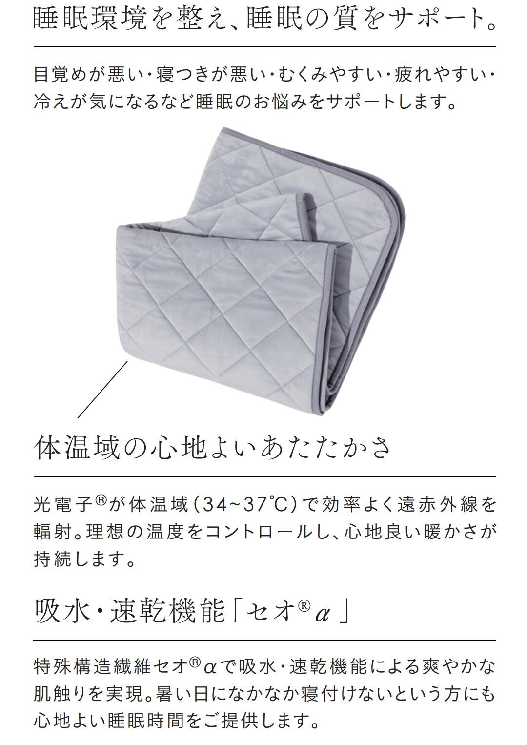 光電子®が体温域(34~37℃)で効率よく遠赤外線を輻射。理想の温度をコントロールし、心地良い暖かさが持続します。