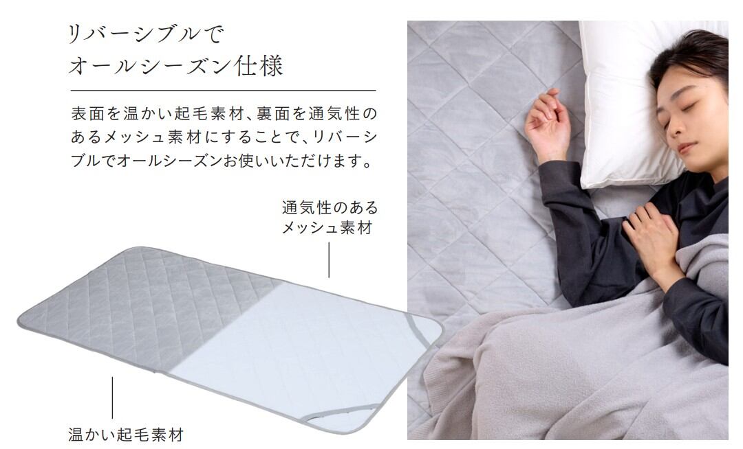 表面を温かい起毛素材、裏面を通気性のあるメッシュ素材にすることにより、リバーシブルでオールシーズンお使いいただけます。