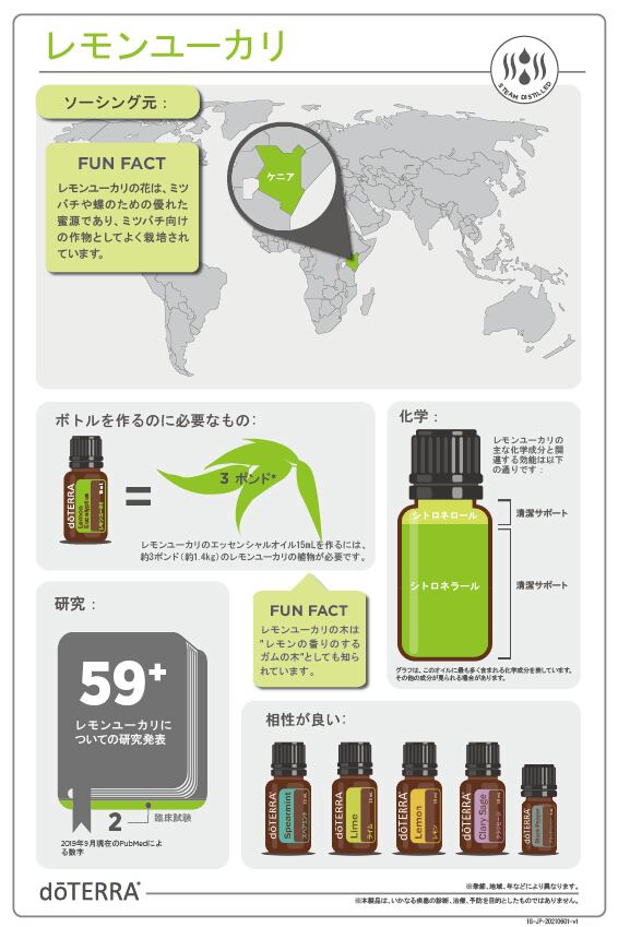 細長い葉から抽出されるオイルは、洗浄力があることで知られるシトロネラールとシトロネロールを含み、レモンを思わせるさわやかで刺激的なグリーン系の香りが特徴です。
