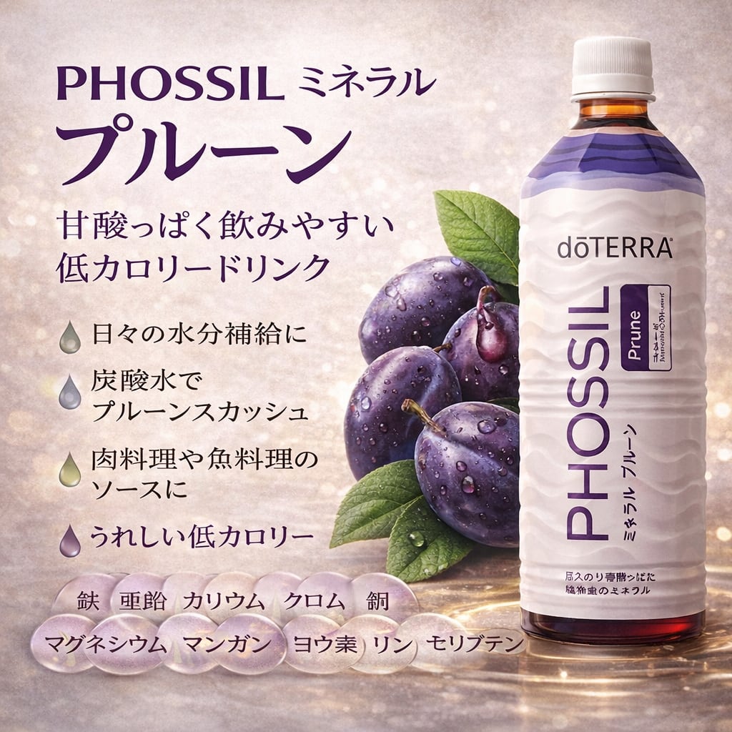 PHOSSIL ミネラル オリジナルにプルーンエキスを配合し、甘酸っぱく飲みやすいドリンクに仕上げました。