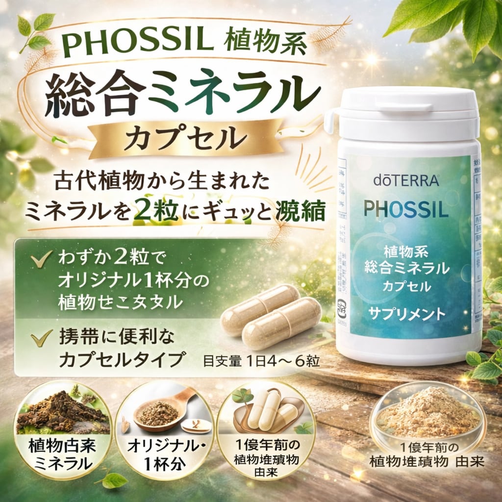 ユタ州エメリー郡で採掘した「約1 億年前の古代植物堆積物」から、精製水でミネラル分を抽出し製造した、多種類の植物由来のミネラルを粉末化し、携帯に便利なカプセルにギュッと詰め込んだPHOSSIL ミネラル カプセル。