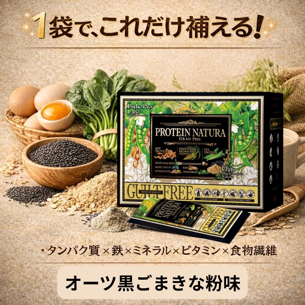 大豆タンパク(アメリカ合衆国製造)、有機アガベシュガー、有機アガベイヌリン、きな粉、黒糖、発芽玄米タンパク、オーツ麦粉末、ドロマイト、黒すりごま、ホワイトチアシード、エンドウ豆タンパク、グルコマンナン、穀物麹抽出組成物、カルシウム(天然水由来)、食塩、みりん粕パウダー、鉄含有酵母、ケール、モリンガ、ブロッコリー、ビタミンD含有酵母、甘藷、マカ、ユーグレナ・グラシリス発酵物、アマランサス、キヌア、クコの実、チアシード、バオバブ、ほうれん草、小松菜、麻の実、苦瓜、明日葉、桑の葉