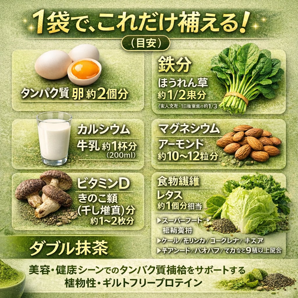大豆タンパク(アメリカ合衆国製造)、有機アガベシュガー、有機アガベイヌリン、抹茶、発芽 玄米タンパク、ドロマイト、ホワイトチアシード、エンドウ豆タンパク、グルコマンナン、穀 物麹抽出濃縮物、ほうじ茶、カルシウム(天然水由来)、鉄含有酵母、ケール、モリンガ、ブロッコリー、甘藷、マカ、ユーグレナ・グラシリス発酵物、ビタミン D 含有酵母、アマランサ ス、キヌア、クコの実、チアシード、バオバブ、ほうれん草、小松菜、麻の実、苦瓜、明日葉、 桑の葉(一部に大豆を含む)