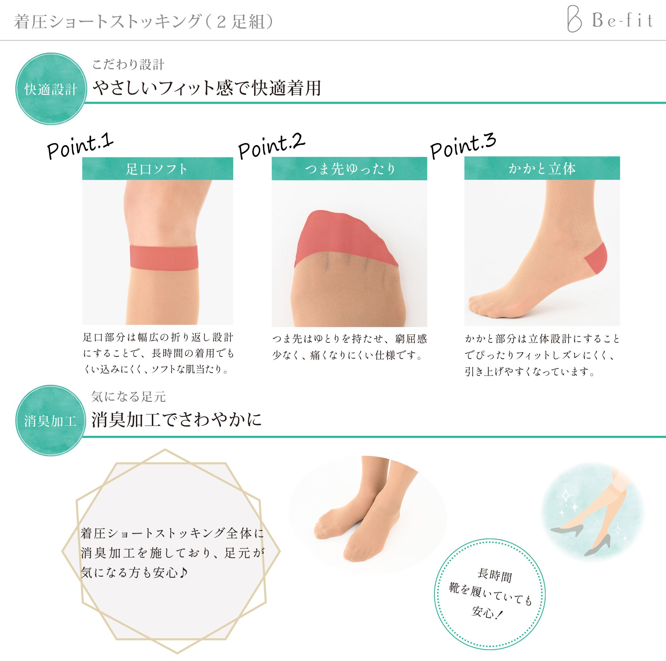足着圧ショートストッキング全体に消臭加工を施しており、足元が気になる方も安心。
