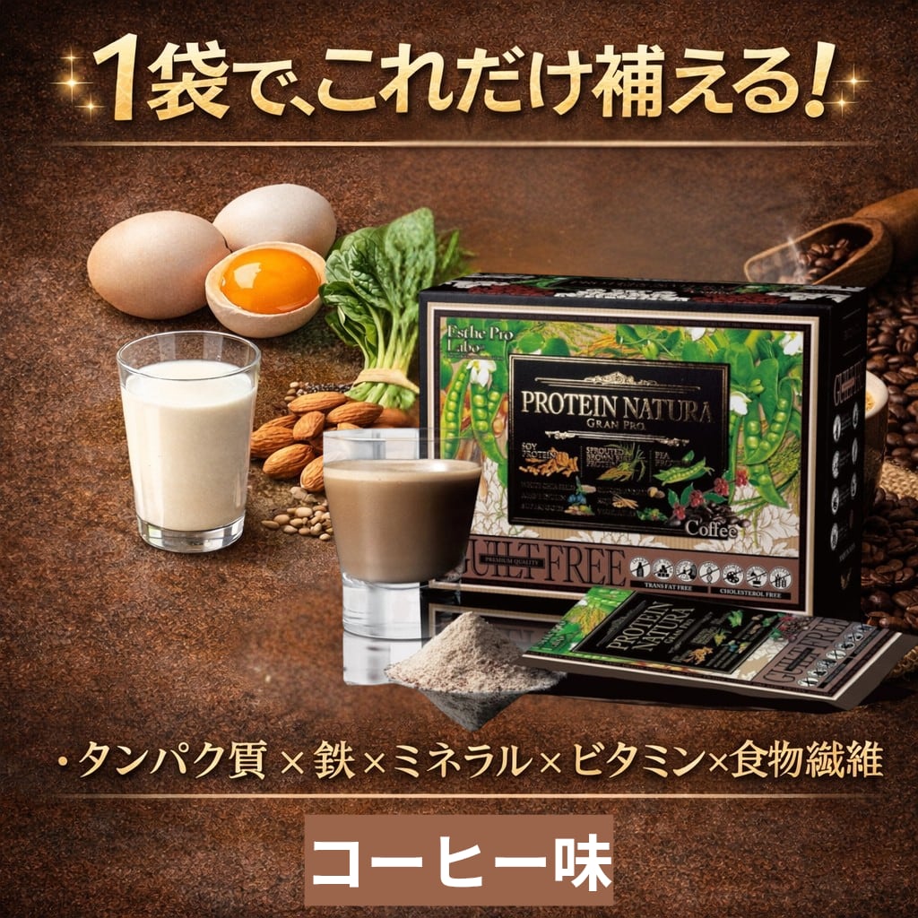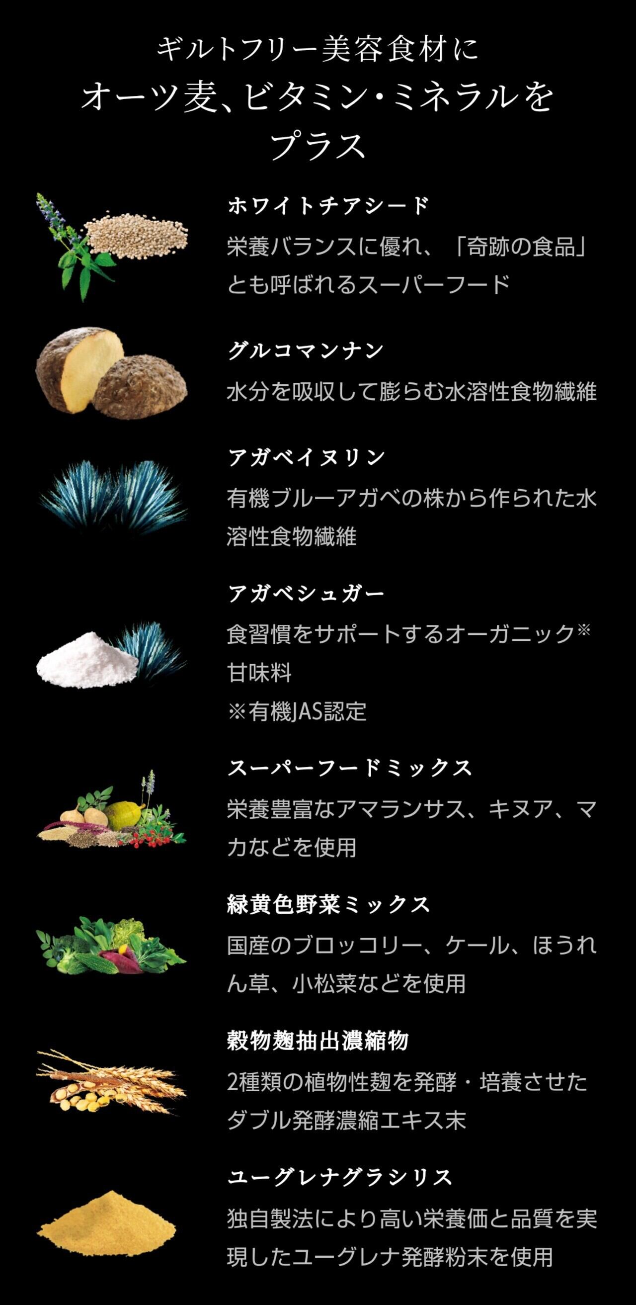 大豆タンパク(アメリカ合衆国製造)、有機アガベシュガー、黒糖、有機アガベイヌリン、コーヒー、発芽玄米タンパク、ドロマイト、ホワイトチアシード、エンドウ豆タンパク、グルコマンナン、穀物麹抽出組成物、カルシウム(天然水由来)、みりん粕パウダー、鉄含有酵母、ケール、モリンガ、ブロッコリー、甘薯、マカ、ユーグレナ・グラシリス発酵物、ビタミンD含有酵母、アマランサス、キヌア、クコの実、チアシード、バオバブ、ほうれん草、小松菜、麻の実、苦瓜、明日葉、桑の葉(一部に大豆を含む)