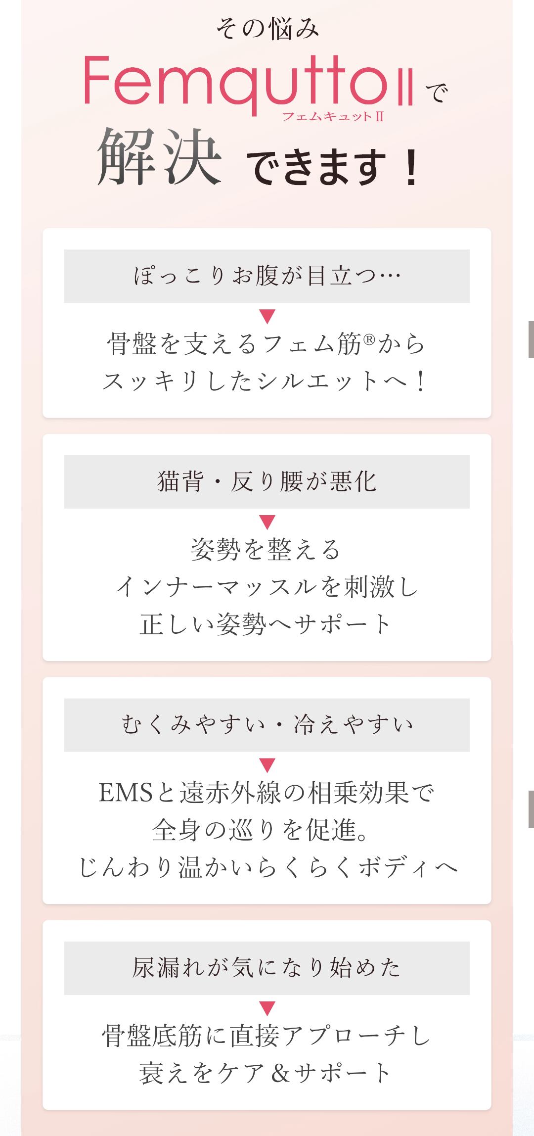 フェム筋にアプローチし女性にとって重要なトリートメントゾーンの骨盤底筋を鍛えてくれます。
